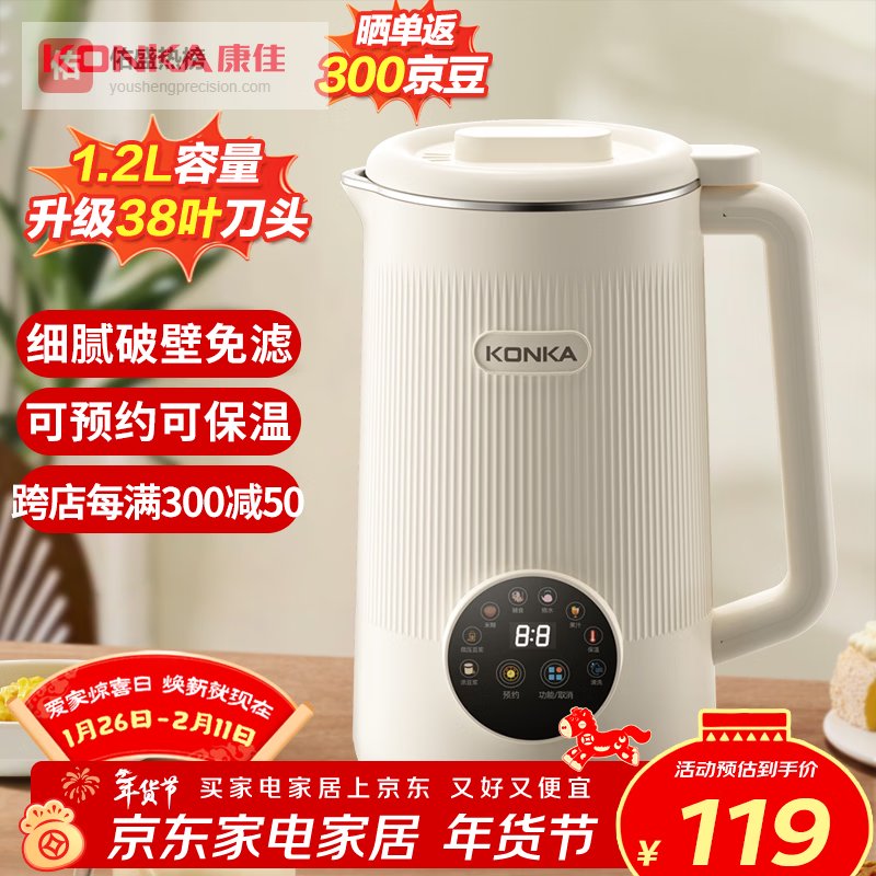 康佳(KONKA)豆浆机 小型破壁机1-2人迷你全自动免煮免过滤家用多功能榨汁机料理机 【升级款】智能保温 | 48叶刀头 1.2L¥