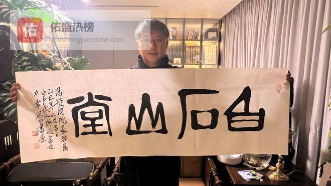 △齐白石后人-齐硕用齐家大篆书写:“白石山堂”,题款:汤发周院长雅属,乙已年九月吉日,白石后人齐硕书于京华砚田书屋。