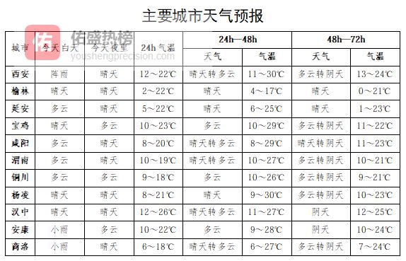 9日:全省阴天间多云,陕南南部局地有小雨或阵雨。10日:陕北多云间晴天,关中、陕南阴天转多云。