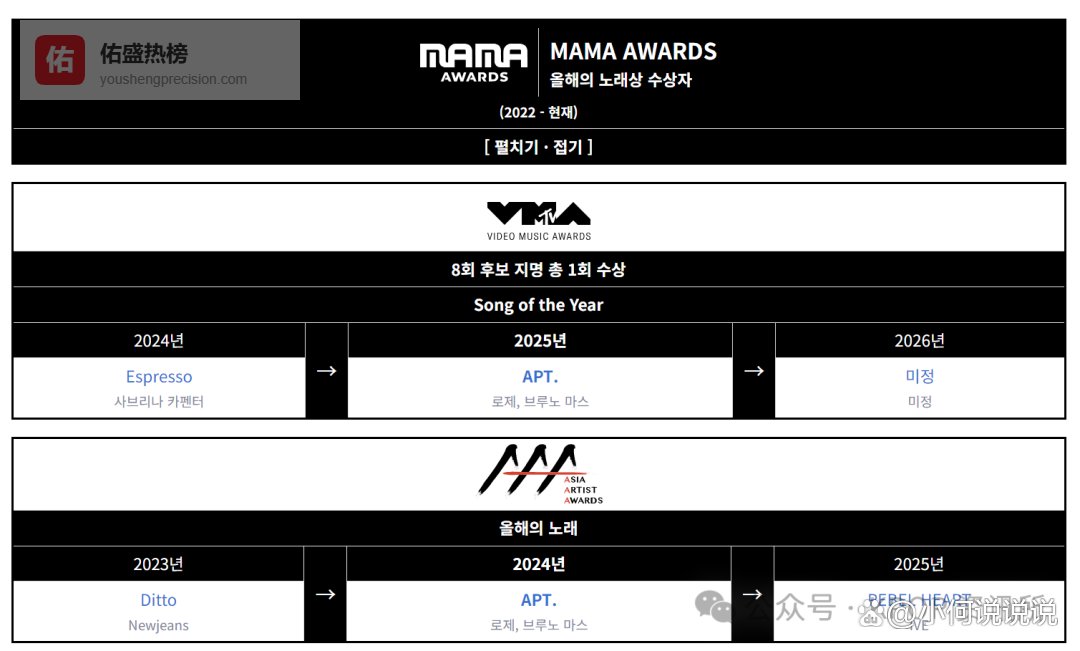 从成绩层面来看,《APT.》此前已入围“年度歌曲”“年度制作”“最佳流行组合/团体表演”三项大奖,虽然最终未能拿下奖项,但歌曲自发行以来在全球榜单上的表现,已经让它成为近两年K-POP在主流市场中最具存在感的作品之一。