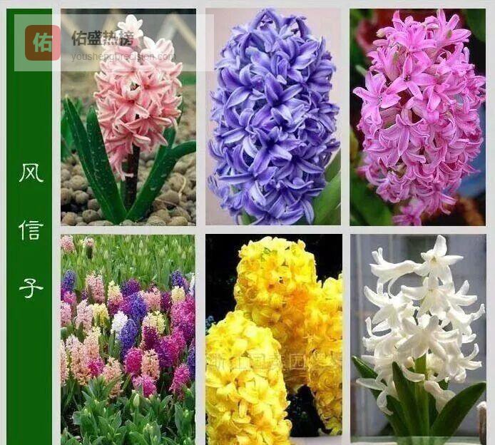 风信子按花色大致可分八系:蓝、粉、白、鹅黄、紫、黄、绯红、红。原种为浅紫,带芳香;蒴果成熟后裂成四瓣,像撒下一把小星星。