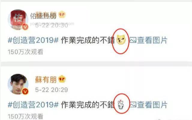 5月22日,一条微博前后两分钟,句子末尾的小表情从比心手势换成doge狗头;
