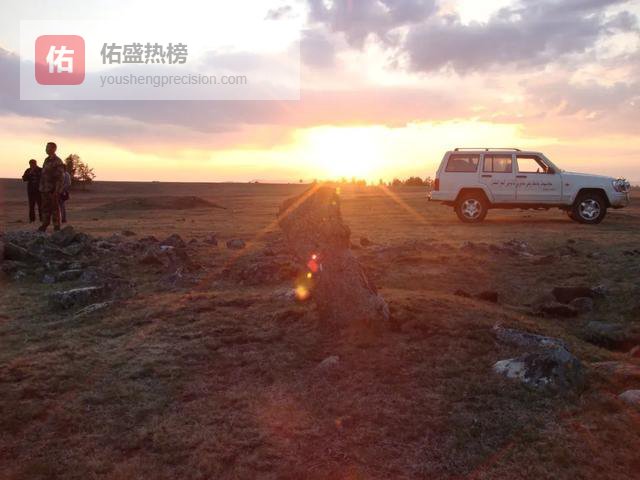我们测量列石墓时,夕阳落在了地平线的边缘,照在列石与北京吉普之间,炫耀出奇异的光芒。