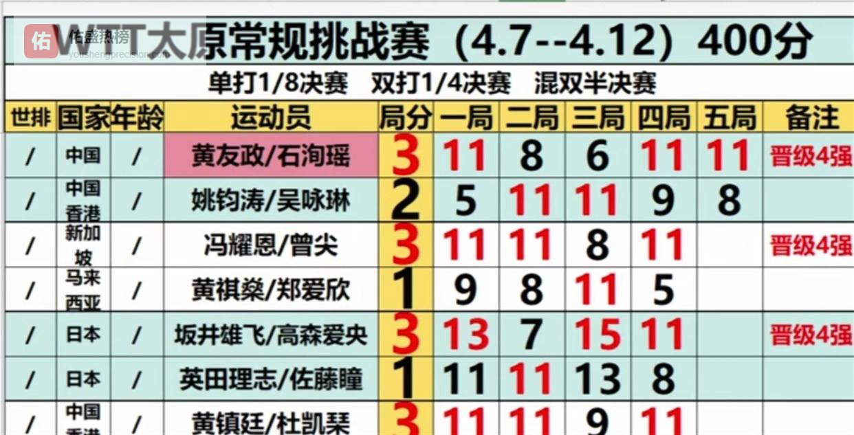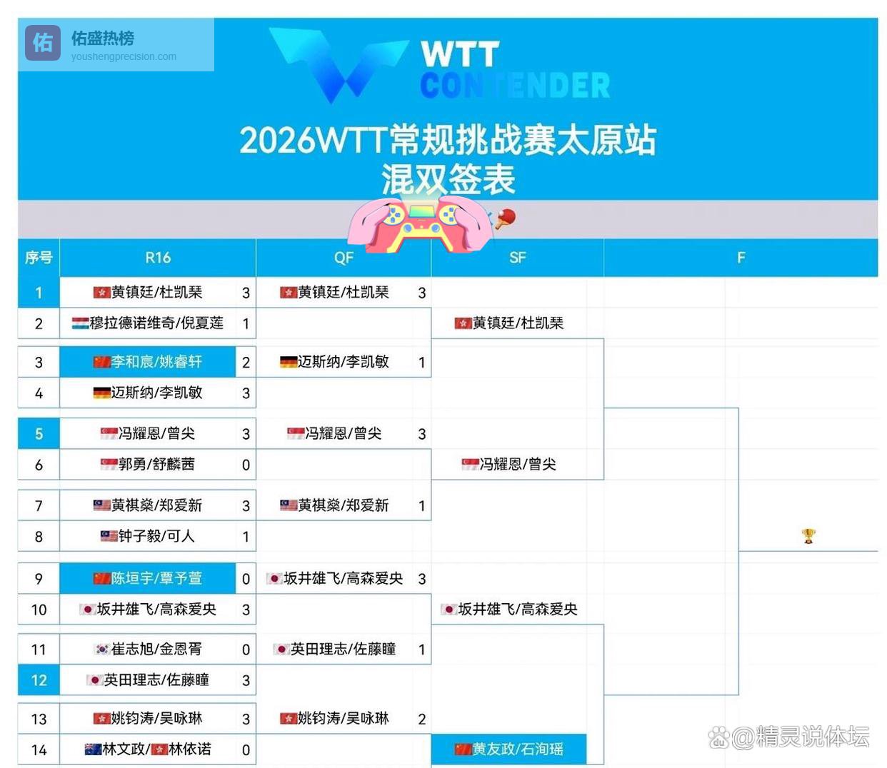 李和宸和姚睿轩那对更憋屈,明明大比分2比0领先,手握好几个赛点,硬是被对手连扳三局给逆转了,赛后球迷都说“五个赛点啊,硬是拿不下来”。 温瑞博和纵歌曼则是输在了内战上,败给了队友黄友政和石洵瑶。