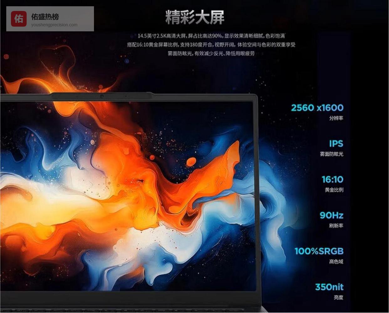 开天N80z G2e-A007配备了一块14.5英寸的2.5K超清屏幕,分辨率高达2560×1600。这块屏幕不仅拥有16:10的黄金比例,能纵向显示更多内容,还具备100% sRGB高色域和90Hz高刷新率。