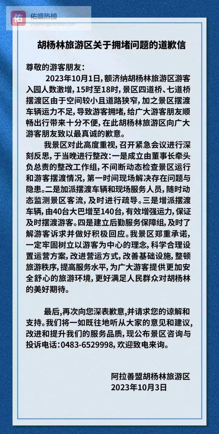 胡杨林最火的时候还没到,内蒙古额济纳胡杨林旅游区已先被官方通报批评。黄金周客流激增,摆渡车运力瞬间告急,游客排长龙的照片刷屏。