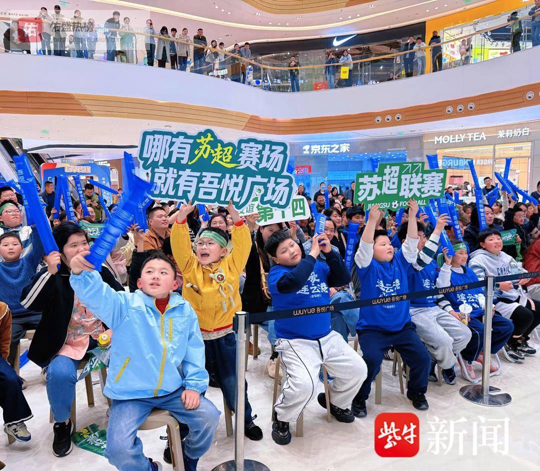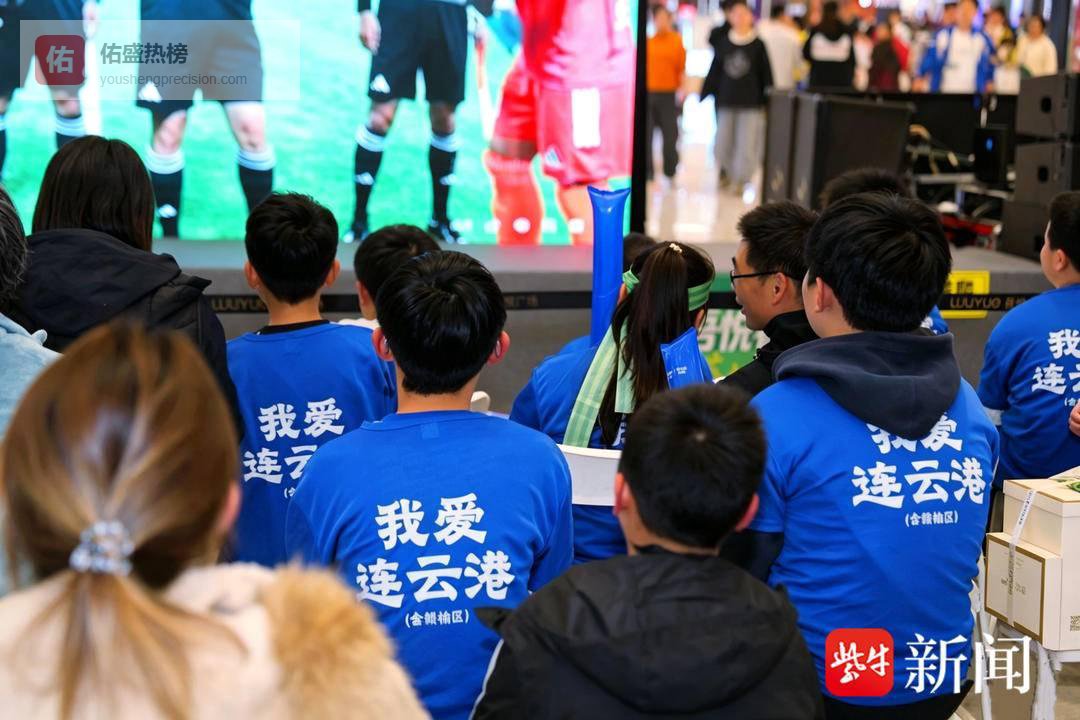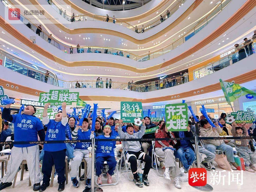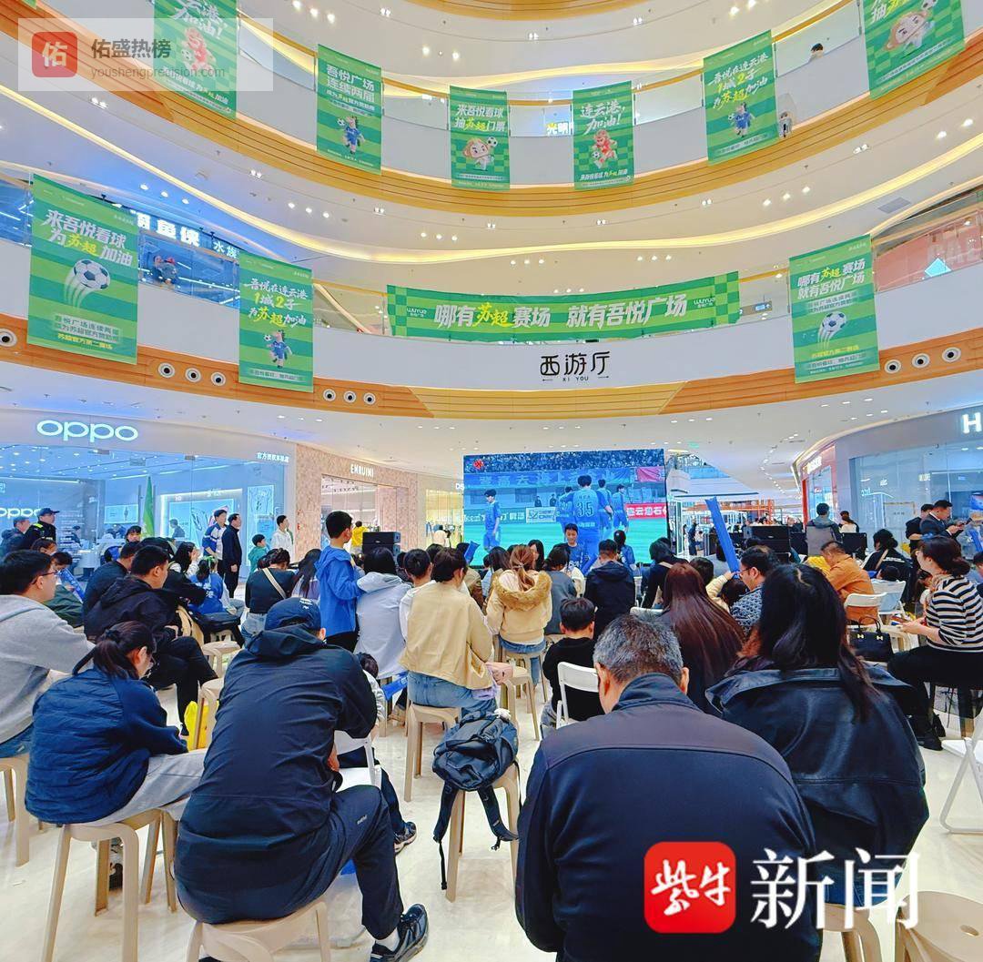另一边,连云港市赣榆吾悦广场西游厅内同样热度爆棚!作为苏超重要观赛点,商场精心打造沉浸式观赛场景,高清大屏实时直播赛事进程,“吃港城海鲜 争苏超之巅”“来吾悦看球 为苏超加油”的标语随处可见,年轻球迷、学生党们穿着蓝色定制服饰,挥舞着应援道具,呐喊声、欢呼声此起彼伏,将现场气氛推向一个又一个高潮。