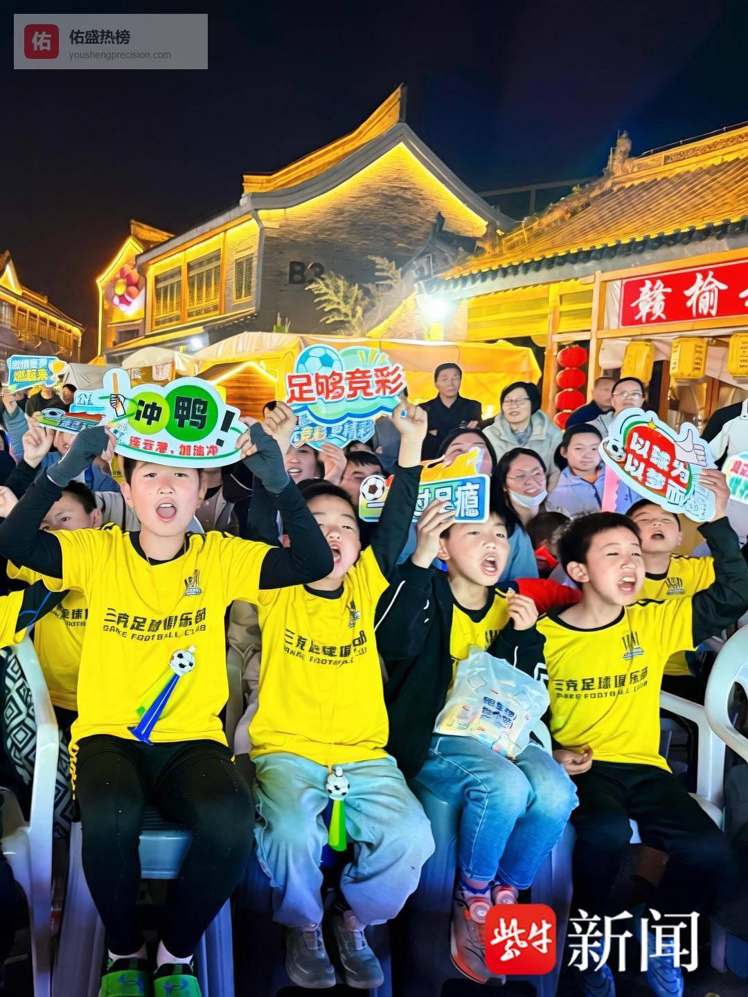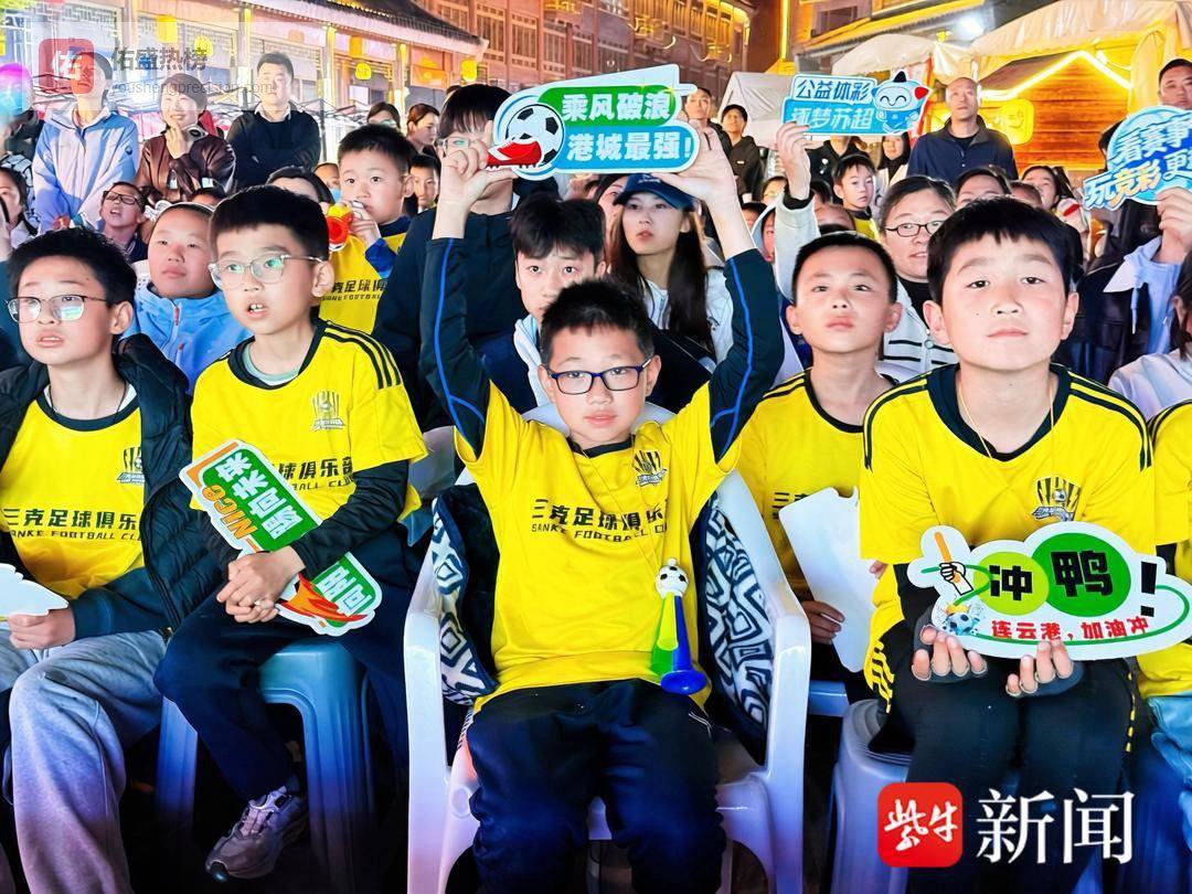热闹的人群中,三克足球俱乐部的50余名小球员身着统一队服,手持“冲鸭!”“乘风破浪 港城最强!”“向阳启航 踢向未来”的应援手牌,整齐列队、精神饱满,为一道亮眼的青春风景线。从球员热身、传球到攻防转换,小球员们目不转睛、满脸紧张,稚嫩又响亮的喝彩声响彻街巷,为现场增添了满满活力。“特意带领孩子们来到现场,感受职业足球赛事的浓厚氛围。”三克足球俱乐部教练陈家旭表示,苏超联赛赛事水平高、对抗节奏快,能让孩子们直观感受足球魅力,引导更多孩子爱上足球、踢好足球,为赣榆足球储备后备力量。”