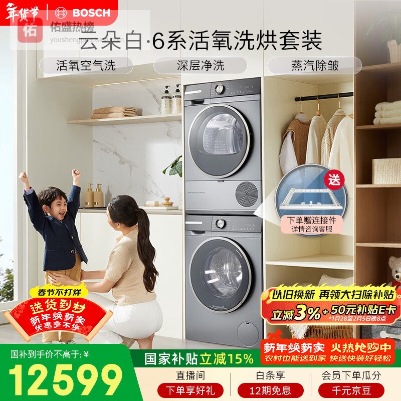 【京东自营】博世云朵白衣物护理中心6系活氧智能投放滚筒洗烘套装WGA254D80W+WQA254DS¥