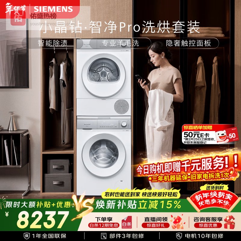 【京东自营】西门子小晶钻智净Pro10+10KG大容量洗烘套装全自动滚筒洗衣机变频热泵烘干智能除渍W¥