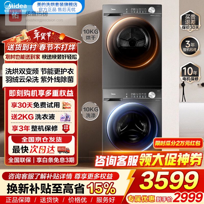 【品牌直营】美的洗烘套装10公斤家用滚筒洗衣机+热泵烘干机组合一体机超薄嵌入以旧换新MG100V36¥
