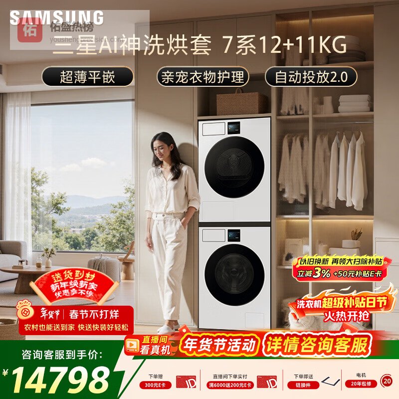 推荐入手:三星AI神洗烘套装7系 12+11KG超薄嵌入