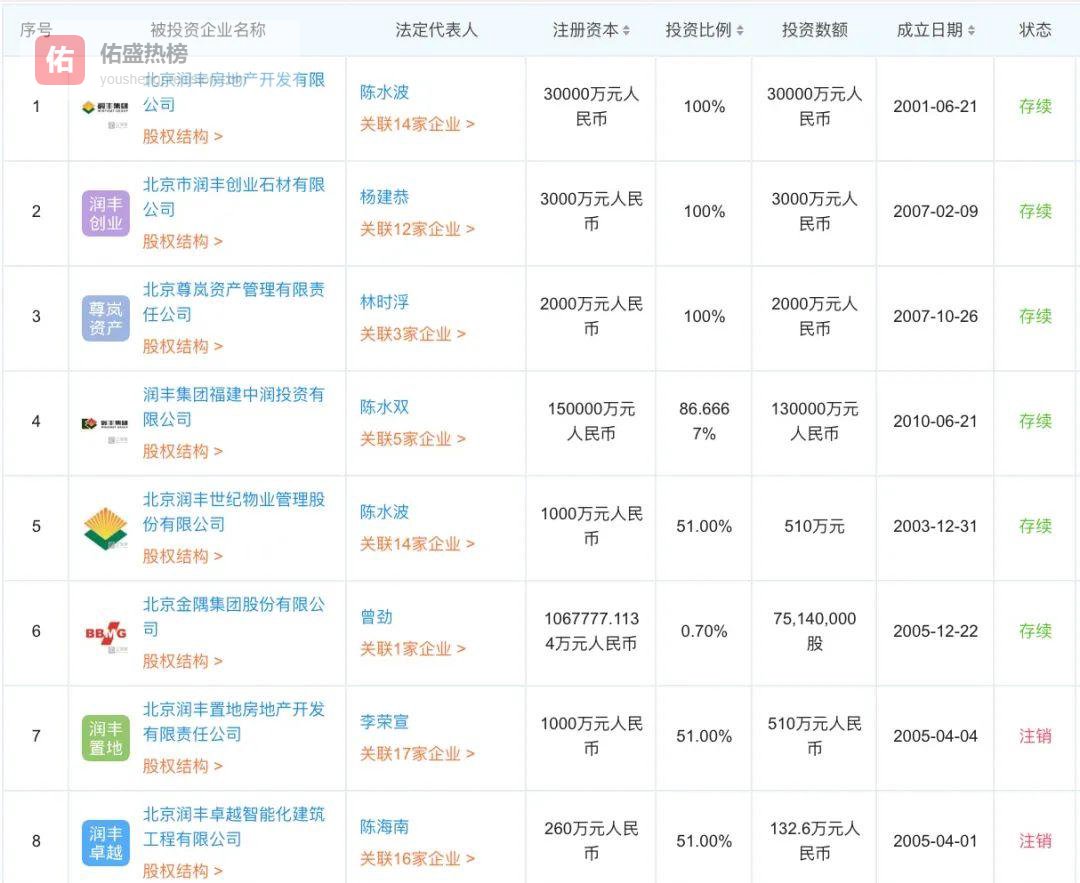 工商信息显示, 润丰地产直接投资的13家公司中5家已注销;润丰集团旗下8家公司里也有2家注销。