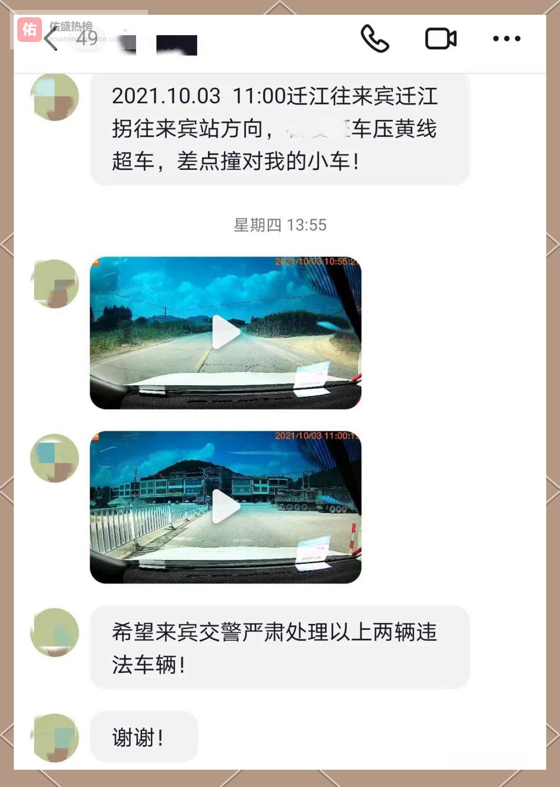 3.1 △ 举报视频10月3日上午,迁江镇往来宾市区方向。一辆黄色出租车与一辆大型客车先后逆行超车、压实线。举报车主连续两次被正对向车道冲来的车辆“贴脸”, 吓得把行车记录仪直接交给交警。