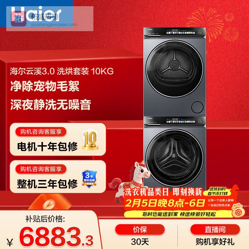 【京东自营】海尔云溪3.0滚筒洗烘套装10KG全自动洗衣机+热泵烘干机家用家电补贴京东自营583+5¥