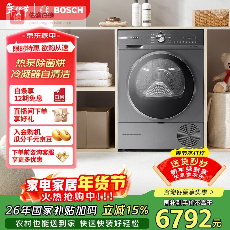 【京东自营】博世云朵白6系热泵家用10KG大容量除菌除螨自清洁变频烘干机WQA254DS0W¥
