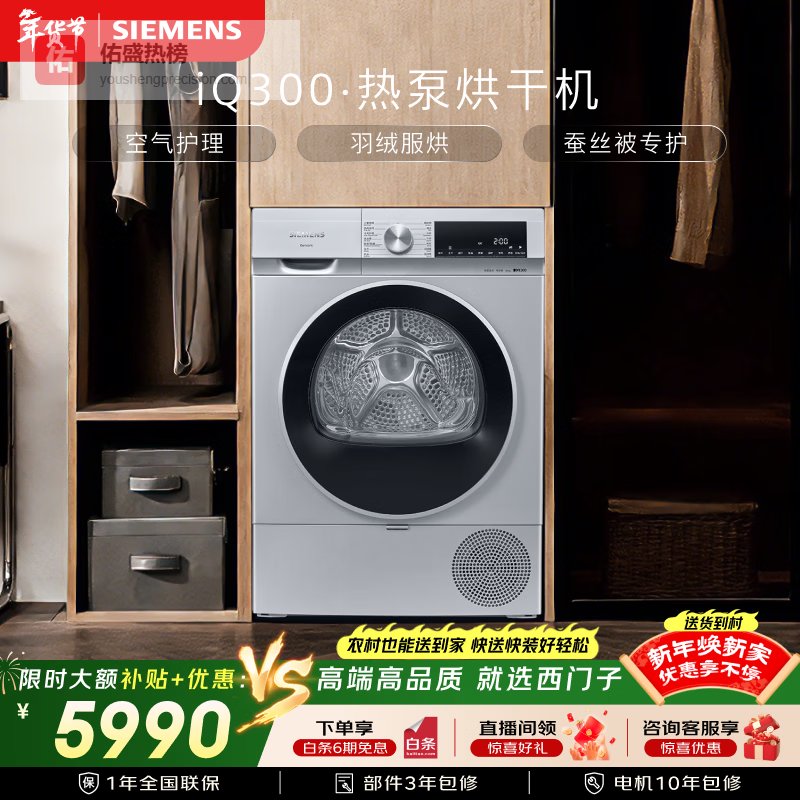 【京东自营】西门子iQ30010KG大容量全自动热泵烘干机除菌除螨多维立体烘干蚕丝柔护羽绒烘WQ53¥