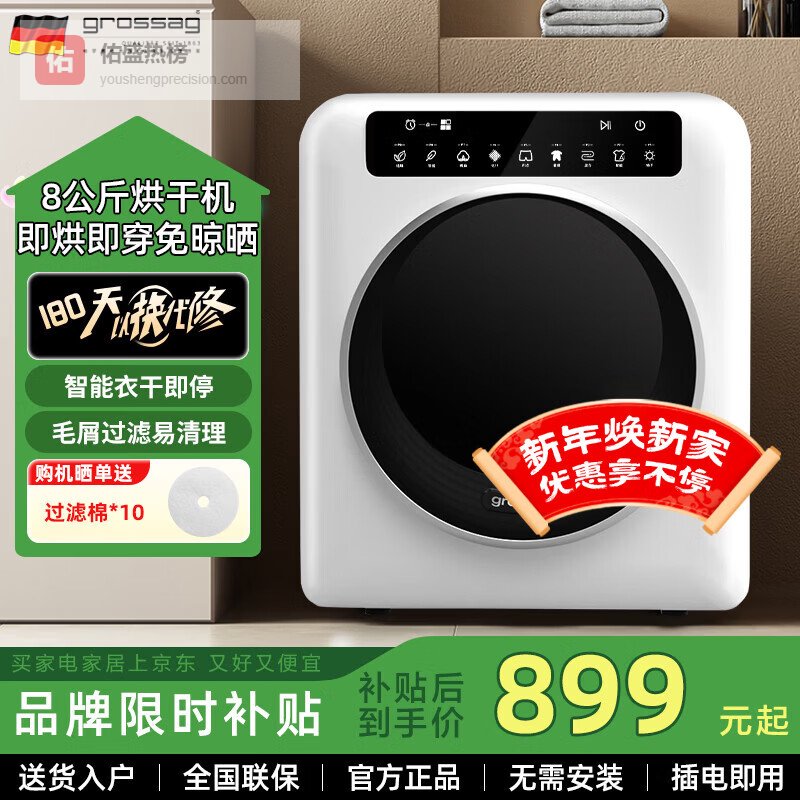 【品牌直营】grossag德国8公斤烘干机家用全自动智能烘衣机直排衣服衣物除菌螨过滤毛屑独立小型滚筒¥