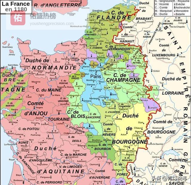 卡佩王朝初期,国王只控制巴黎周边一小块地,叫“法兰西岛”,周边全是香槟、勃艮第、阿基坦这些大公爵国。