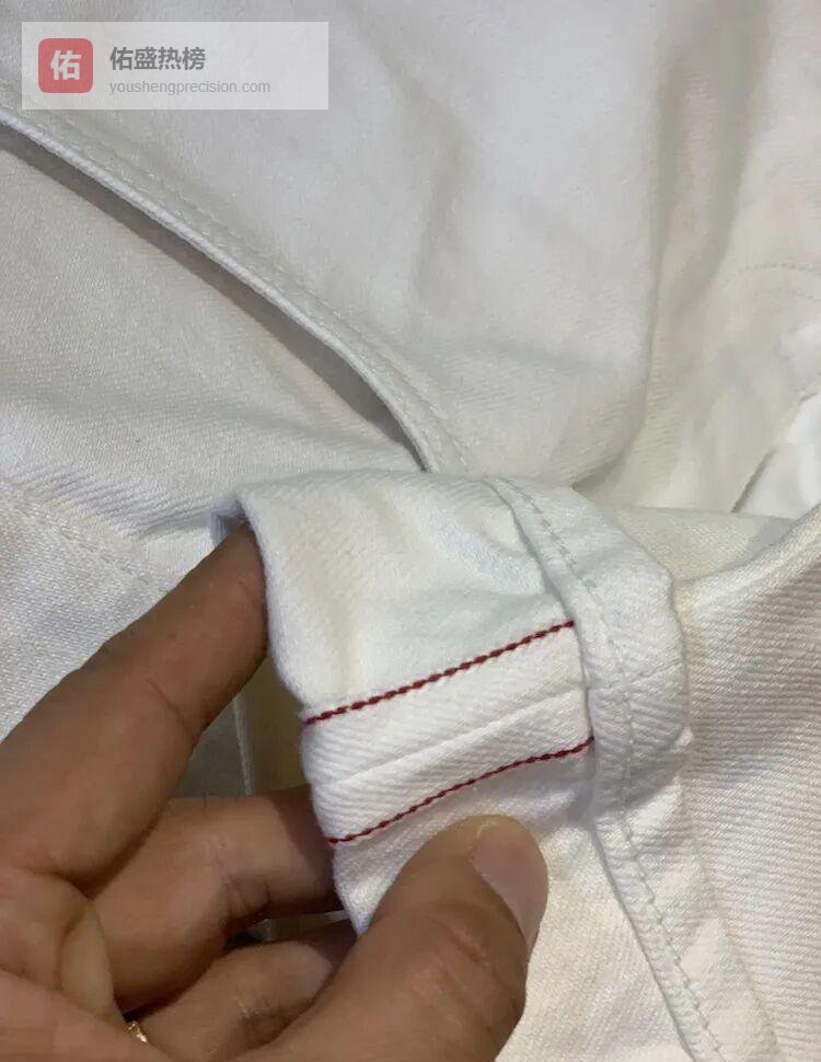 4.2 △ JOHN五口袋牛仔白修身小直筒+中高腰,红色布耳边+银色铝制五金,把柔软牛仔布做出硬朗线条;铆钉纽扣替代拉链,街头感与绅士感各半。