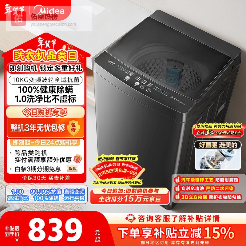 【京东自营】美的滚筒洗衣机全自动10公斤家用超薄一级能效内衣洗1.1洗净比MG100V36T以旧换新¥