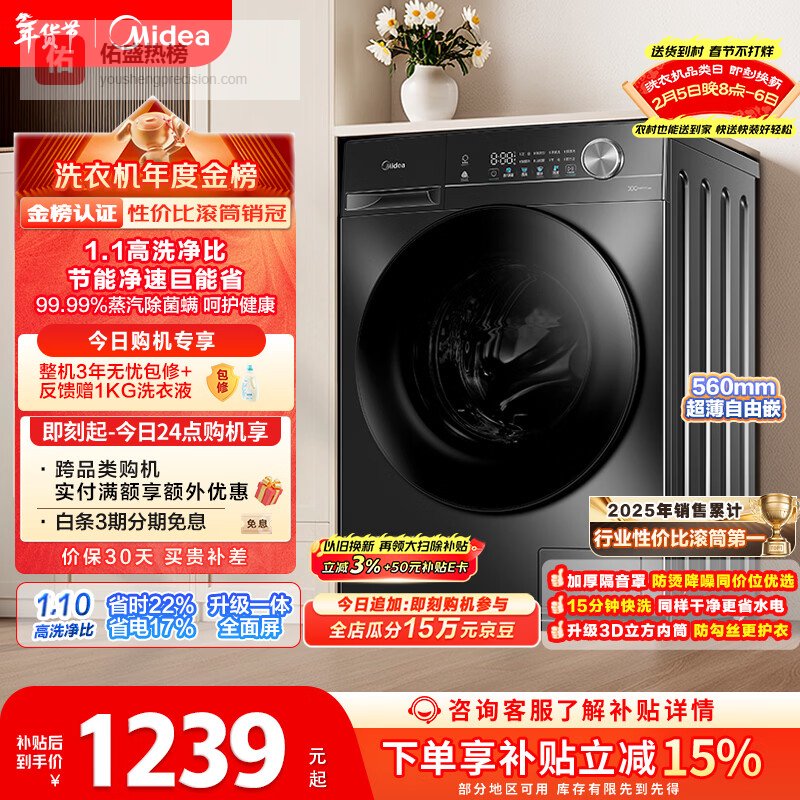 推荐理由:这款洗衣机不仅具备极高的能效,帮助节省电费,还通过抗菌技术为家庭提供健康洗衣环境,为每次洗涤带来安心与便捷。