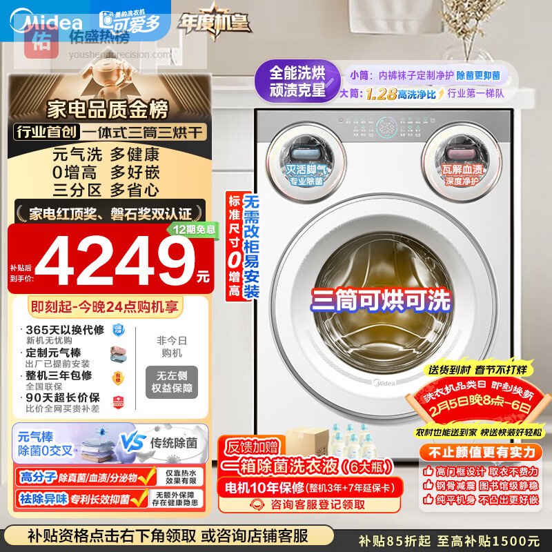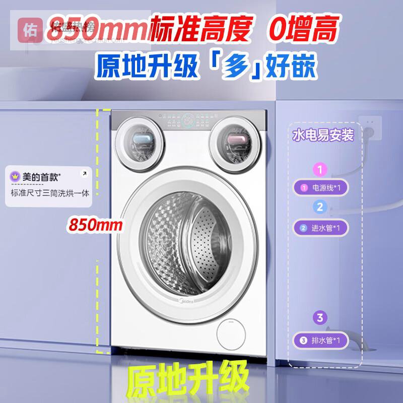 【京东自营】美的可爱多滚筒洗衣机全自动带烘干洗烘一体11KG三筒内衣洗三桶年度机皇MD11DDEX以¥