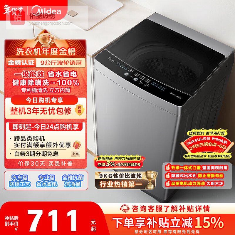 【京东自营】美的随心洗波轮洗衣机全自动家用9公斤专利免清洗健康除螨MB90V33B以旧换新国家补贴京¥