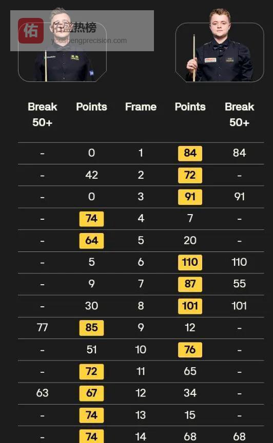 这一局就像捅破了一层窗户纸,也彻底击垮了穆迪的心理防线。随后的比赛完全进入了威尔逊的节奏,他连赢三局,一口气打出了惊人的七连胜,最终以10比7完成了这场不可思议的大逆转。全场比赛的技术统计对比极为刺眼:穆迪2杆破百,4杆50+;威尔逊0杆破百,仅2杆50+。一场数据上被全面碾压的比赛,却以这样的方式收场。赛后,威尔逊将胜利归功于经验,他说在克鲁斯堡,经验往往能在关键时刻发挥作用。而穆迪,则为自己的年轻付出了昂贵的学费。