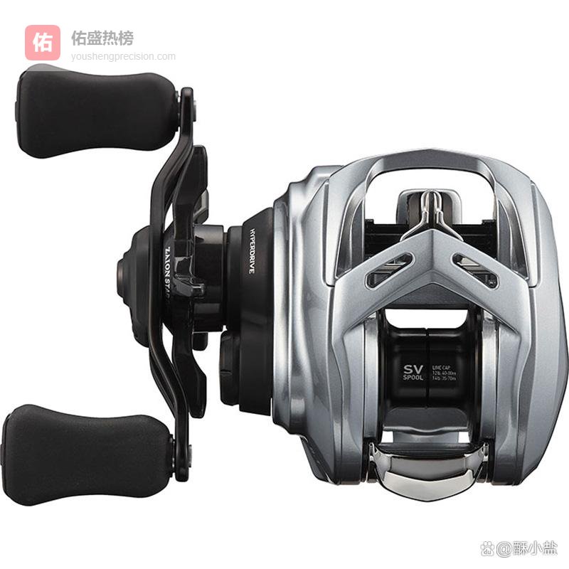 它的核心亮点是HYPERDRIVE高效传动系统,齿轮咬合紧密、动力损耗极低,长时间摇把不累手;线杯上清晰标注“SV,SPOOL”,说明支持精准微物抛投和大容量储线能力,应对复杂水情更有底气。