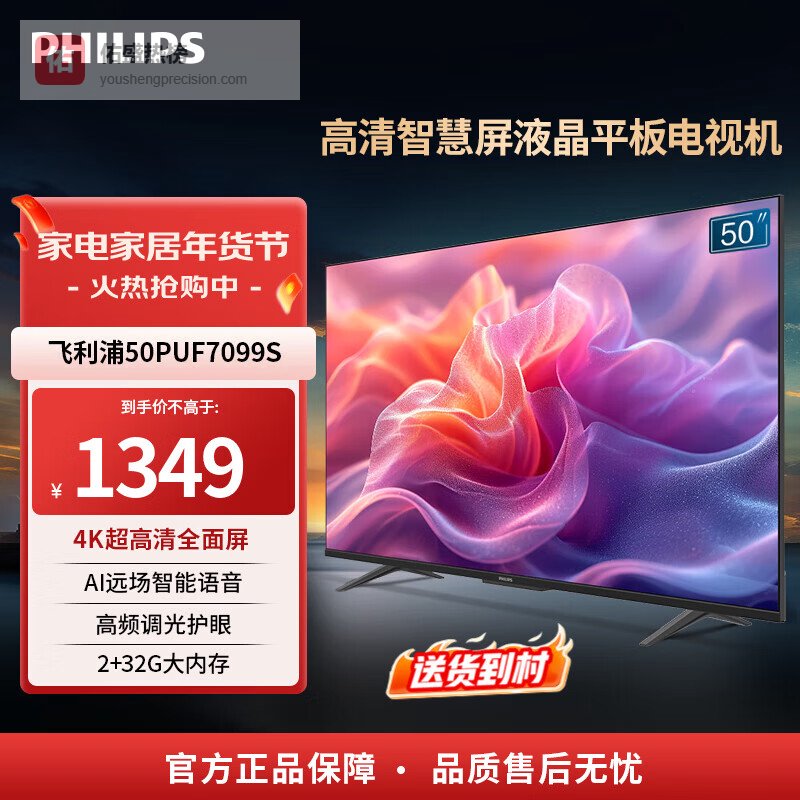 飞利浦(PHILIPS)50英寸电视 4K超高清智慧全面屏2+32G 金属机身 客厅远场语音智能液晶平板电视机 50PUF7099S/T3 50英寸 海量腾讯影视¥