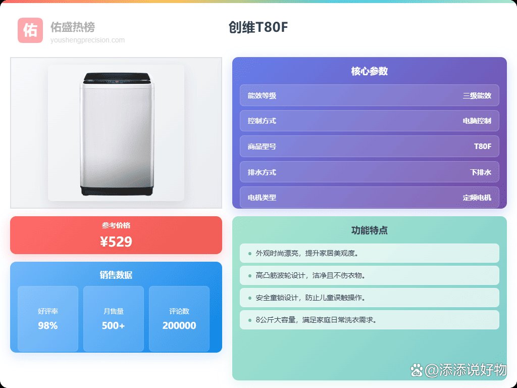 推荐理由:这款创维T80F洗衣机容量达8公斤,家庭使用真的挺方便,无论是衣服、床单还是被罩,都能轻松应付。操作起来也很简单,LED显示屏让你一看就懂,不用担心搞不清楚状态,使用体验挺顺手的。