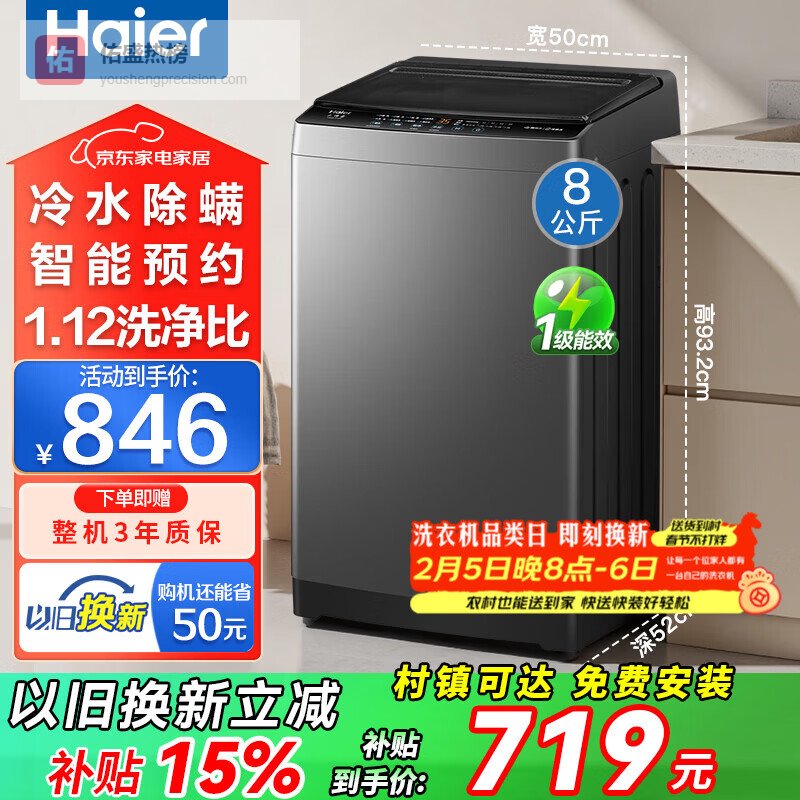 推荐理由:这台海尔8公斤波轮洗衣机,倒是挺适合一家三口的,大容量设计一次洗完一周衣物,省去多次洗衣的麻烦。它采用的超微净魔方技术,能够生成立体水流,深层包裹每一件衣物,洗得更干净、更均匀,看得见的洁净效果。