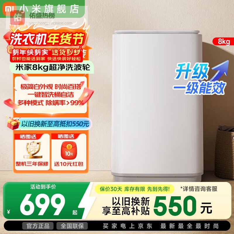 推荐理由:这款米家8KG波轮洗衣机,容量足够大,一次能洗完全家的衣服,比如窗帘、被套都没问题,省得反复分批洗。采用超净洗技术,能更有效去除污渍,洗得干干净净,让衣服焕然如新。