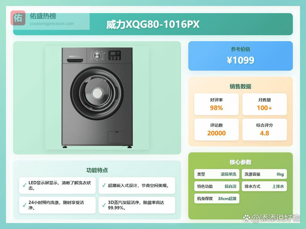 推荐理由:这款威力XQG80-1016PX洗衣机,超薄机身最薄仅38厘米,特别适合空间有限的小户型或卧室,不占地方还能放得下。它还配备了96℃高温除菌功能,能有效杀灭99.99%的细菌,让家人的衣物更健康、干净,特别适合有宝宝和敏感肌肤的家庭。