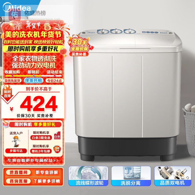 美的(Midea)双桶半自动洗衣机8kg 双缸大容量家用品质双电机 净洗科技同洗同脱二级能效以旧换新 8公斤 双缸¥
