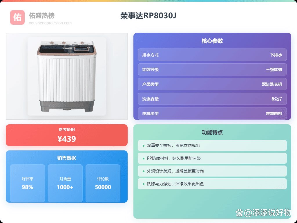 推荐理由:这款荣事达RP8030J洗衣机,容量达到8公斤,一家人的衣物都能一次洗完,特别适合家庭使用,不用费事多次洗衣。它的双筒设计,让洗涤和脱水可以同步进行,效率更高,节省时间。