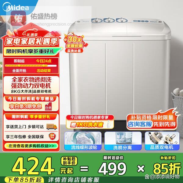 推荐理由:这款美的MP8DS136洗衣机,真正做到了让你洗大件也不用担心。8公斤的容积,轻松搞定窗帘、沙发套、四件套什么的,省时省力还舒服,家里大件洗完衣服都不愁。它搭载的双电机,洗涤和脱水两个动作分开独立运行,动力十足,运行也更稳定耐用,而且还带热保护器,避免堵转和生锈的问题,倒是挺靠谱。