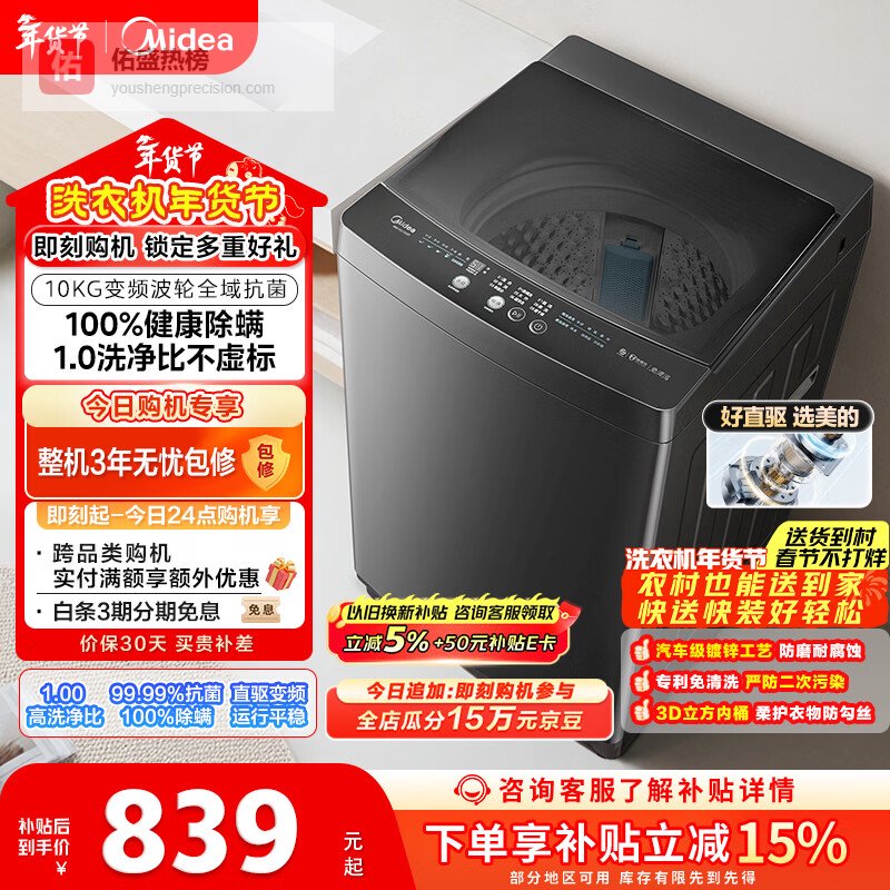 【京东自营】美的随心洗波轮洗衣机全自动10公斤直驱变频专利免清洗MB100V36DT以旧换新国家补贴¥