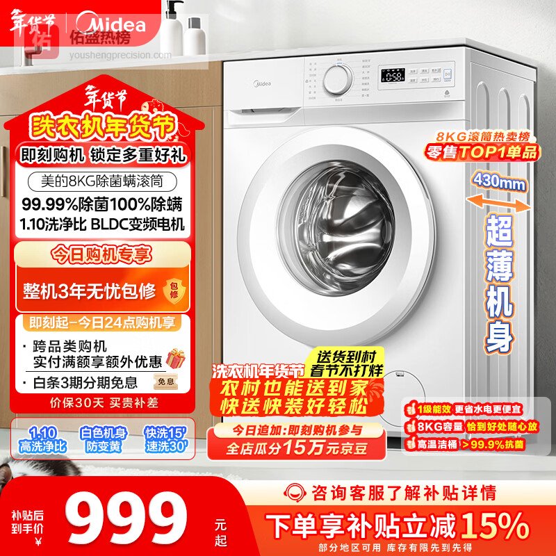 【京东自营】美的滚筒洗衣机全自动8公斤家用超薄小型租房用巴氏除菌MG80V01JPY以旧换新国家补贴¥