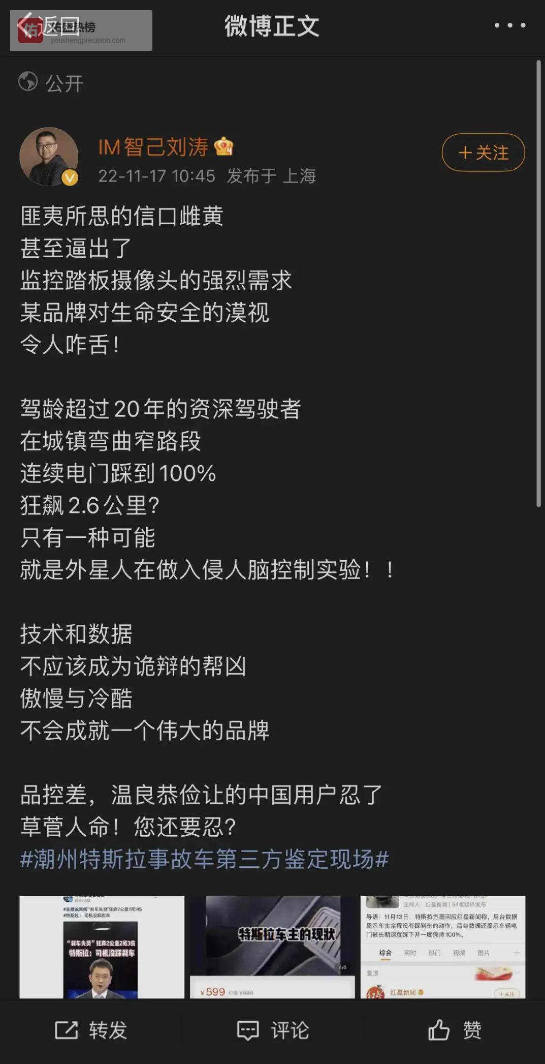 原因要追溯到两年多前。2022年11月,广东潮州那起轰动全国的特斯拉"失控"事故。当时刘涛迫不及待跳出来,用"信口雌黄""草菅人命""漠视生命安全"等激烈措辞炮轰特斯拉,甚至嘲讽"逼出了监控踏板摄像头的强烈需求"。