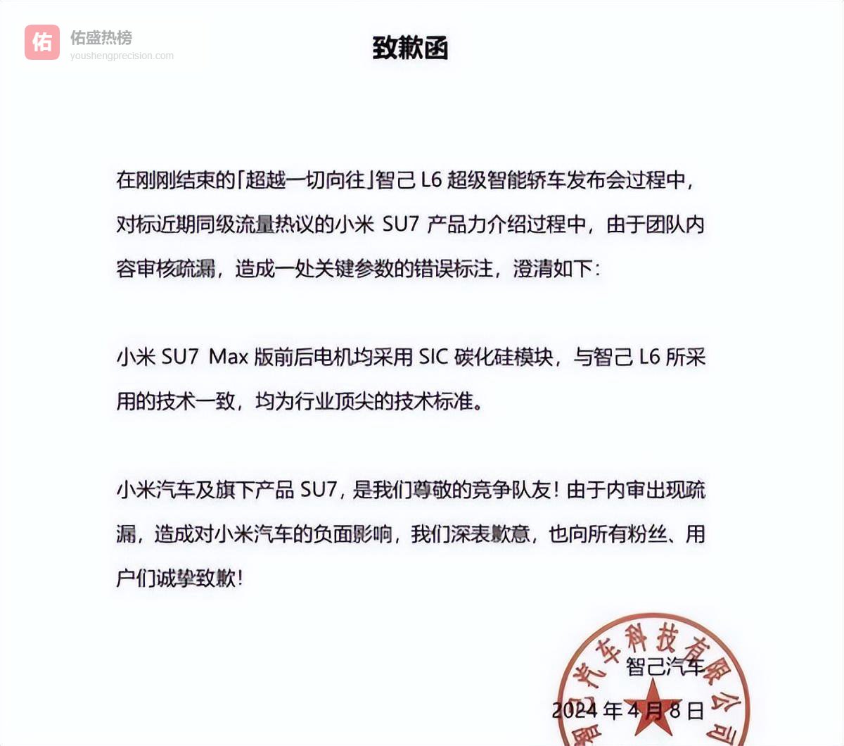这不是智己第一次道歉。去年4月,智己L6发布会上硬蹭小米SU7流量,结果把小米的SiC碳化硅电机参数标错,引发小米连发三文反击。智己土味儿十足的"卖惨式道歉"三连,CEO个人微博、官方账号、举报信称自己遭遇"有组织网暴"。彼时刘涛还在发布会上讲员工"连干几盒泡面""错过孩子出生"的悲情故事,结果被骂成"歌颂苦难"。