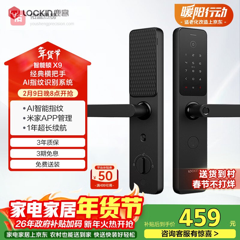 【京东自营】鹿客智能门锁AI指纹识别系统一握即开APP智联指纹锁密码锁电子锁X9¥