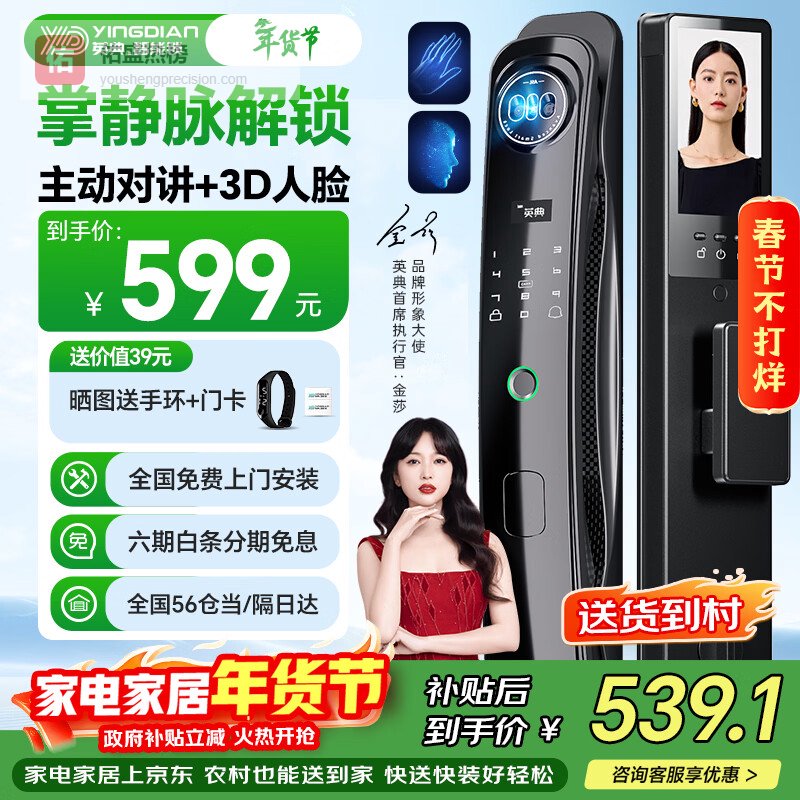 【京东自营】英典R10掌静脉智能门锁指纹锁3D人脸识别智能锁电子锁入户门密码锁¥