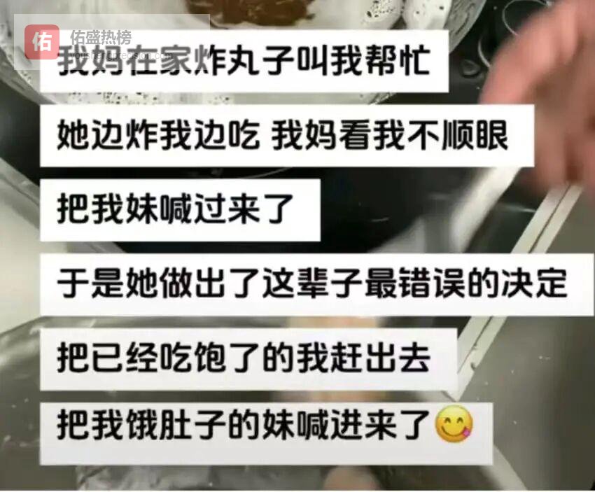 有妈妈在家里炸丸子叫女儿帮忙,妈妈一边炸,女儿一边吃,吃了一会儿,妈妈看大馋丫头不顺眼,做了这辈子最错误的决定——把妹妹喊了进来。