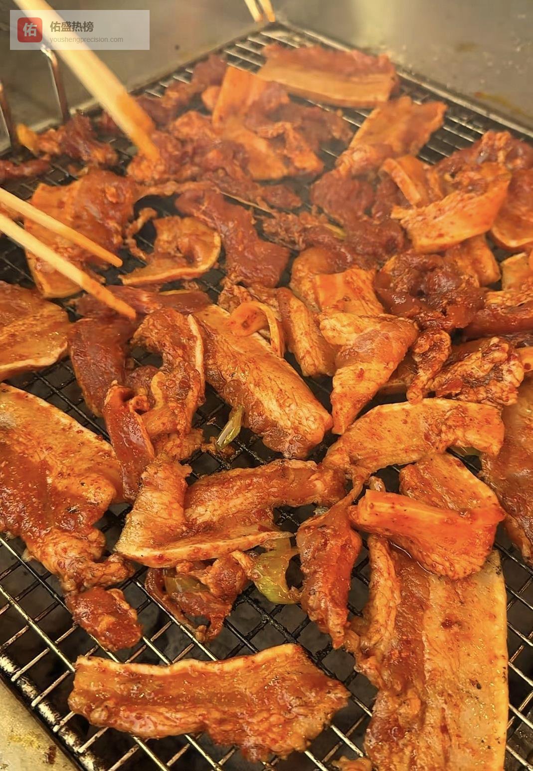 朱兆祥有样学样,直接用手抓起一块烤五花肉。