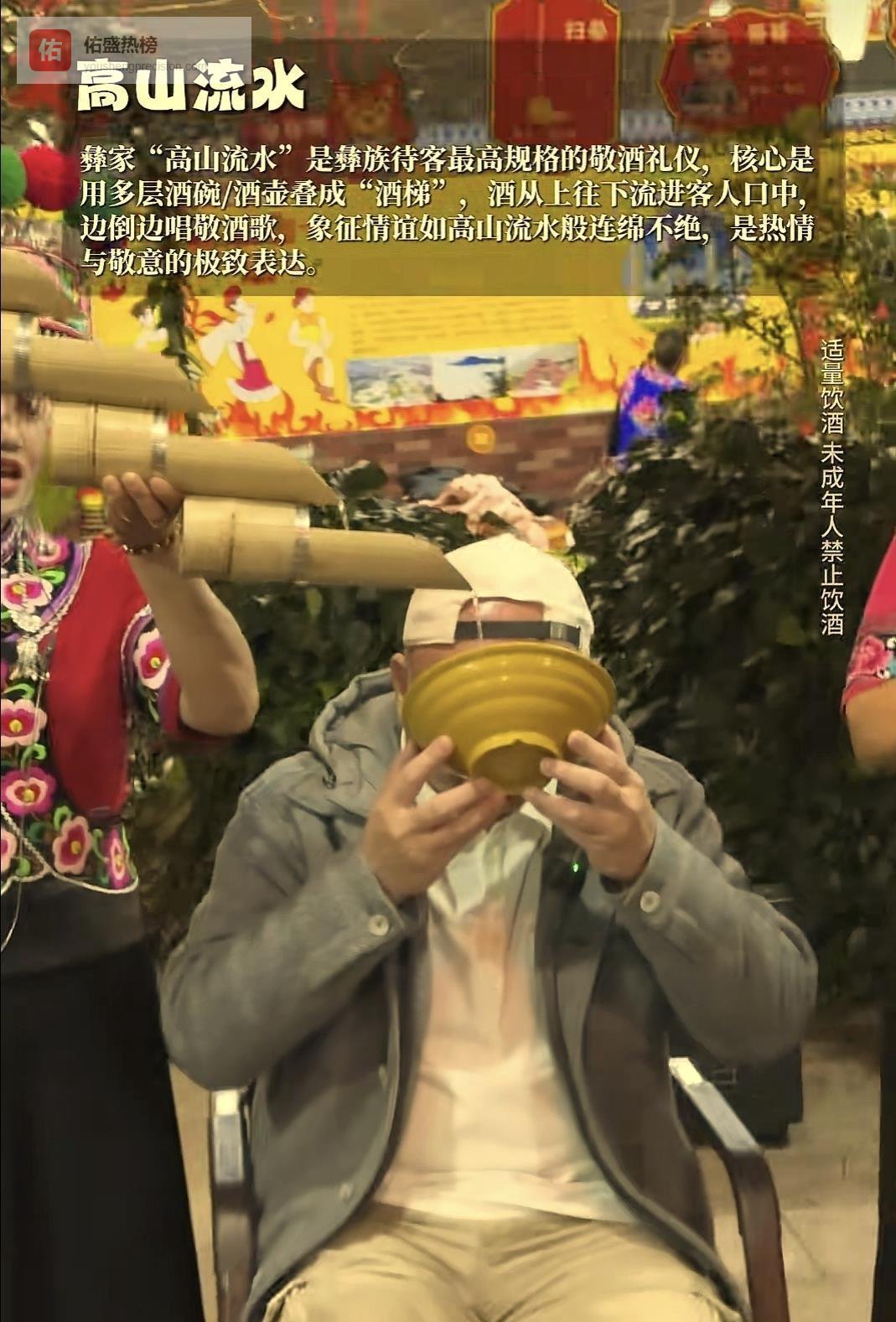 高山流水来了。这名字听着诗意,实操起来是另一种硬核。几个姑娘小伙,歌一唱起来,酒壶就垒起来了,从高到低,斜斜的一条线。酒不是一杯一杯倒的,是连成一条线往下流,像个小瀑布,直接流进你嘴里。你得接着,不能断。
