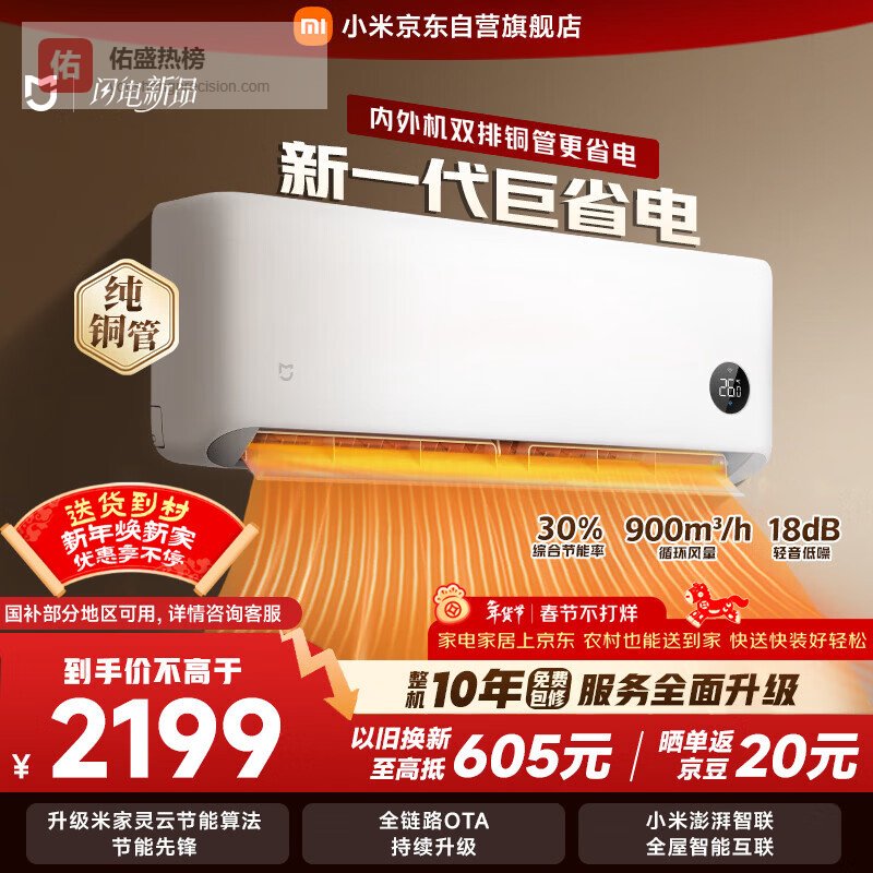 【京东自营】小米空调米家巨省电双排款1.5匹一级能效内外机双排铜管空调挂机35GW-PG15/N1A¥