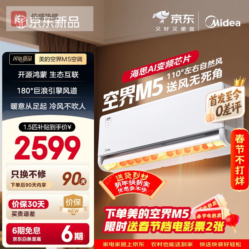 【京东自营】美的空调空界M5大1.5匹新一级能效舒适风节能省电【纯铜管】卧室空调挂机国家补贴KFR-¥