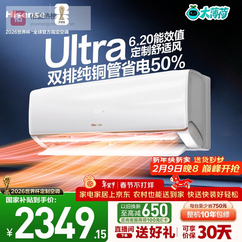 【京东自营】海信大薄荷智省电Ultra世界杯定制空调大1.5匹双排铜管AI省电50%双翼定制风KFR¥
